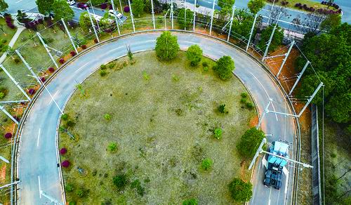 该示范线位于湖南株洲,由中车株洲所联合清华大学、三一集团等共同研制开发,全线为双向两车道,道路宽7米,架设53根组立支柱共计1.8公里接触网及1处箱式变电站,线路涵盖直线、弯道、坡道、凹凸路面、涉水和浸泡试验区等多种路况,为测试车辆性能、系统可靠性提供丰富的模拟场景,为后期商业运行提供参考和依据。