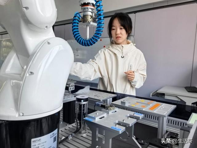 平时,他们一周上五天课程,包括电力、机械以及软件编程等课程。记者在教室里看到,有一个机械臂的装置。她们会学习编程,控制机械臂进行各种细微操作。同时,还有一个巨大的线路墙,用来实际进行操控。这些机械臂,如今在工厂里实际应用非常广泛。