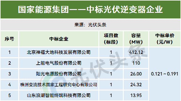 华电集团18GW逆变器集采项目确定中标人,阳光电源、华为、特变电工、中车时代电气(株洲变流)、山东华电节能技术有限公司等5家企业成为最大赢家,合计赢得18GW订单。
