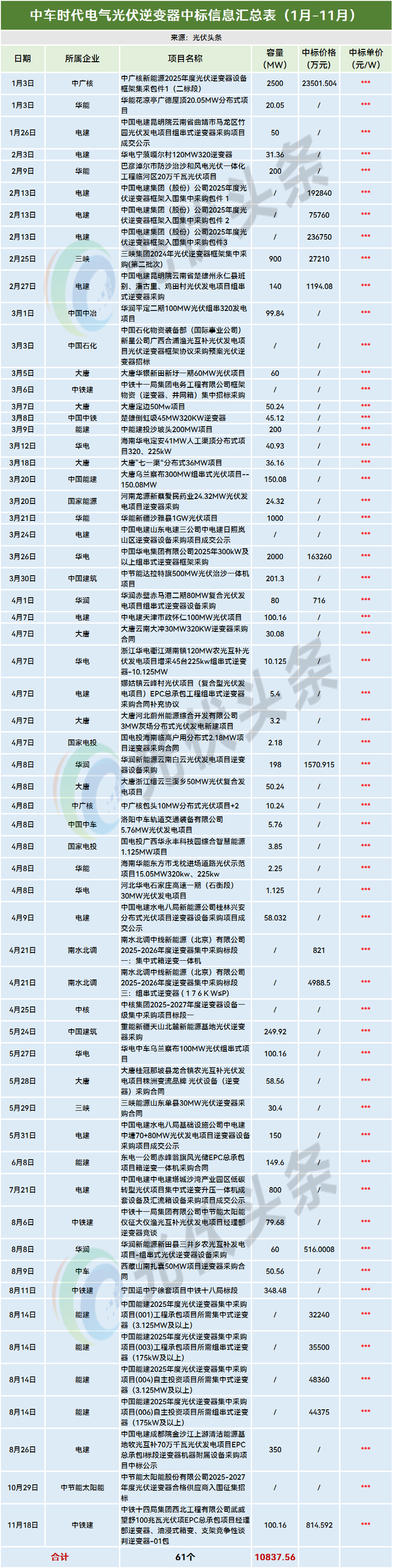 其中,光伏头条根据公开信息统计,中车时代电气(株洲变流)1-11月平均中标价格为0.103元/W。