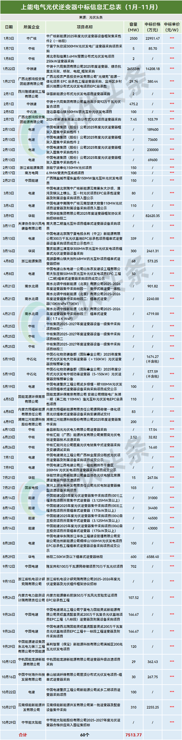 光伏头条根据公开信息统计,2025年1-11月,央国企约309个光伏逆变器招标项目,合计容量约123.92GW。