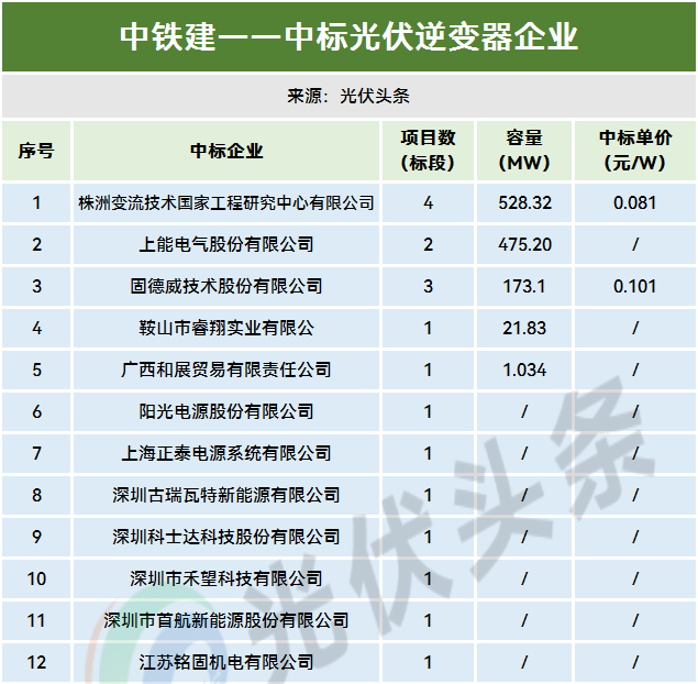 本统计周期,中铁建有19个项目定标,合计容量1200.69MW。中车时代电气(株洲变流)、上能电气、固德威、阳光电源、正泰电源、古瑞瓦特、科士达、禾望电气、首航新能等12家企业中标。