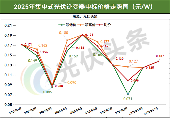 光伏头条根据公开信息统计,华为1-11月,光伏逆变器中标均价为0.129元/W。