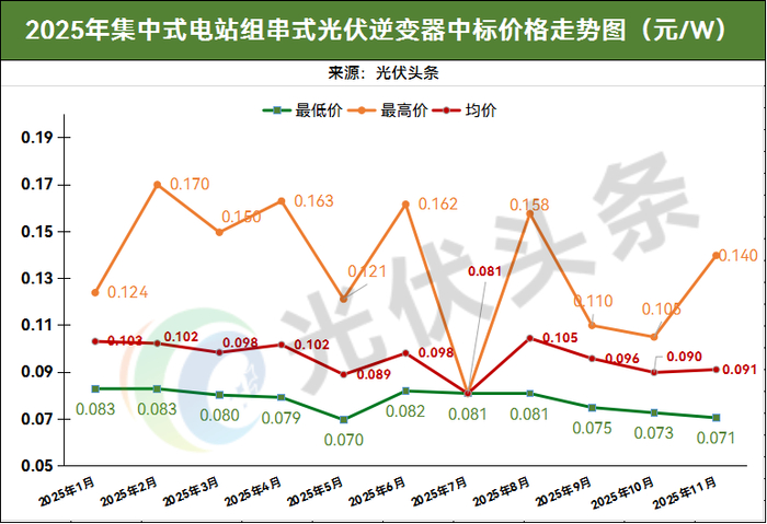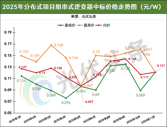 集中式项目方面,1-11月,组串式逆变器均价稳定在0.11元/W左右,其中,10月组串式逆变器均价为0.121元/W,11月与10月相比,均价下降24.8%,来到0.091元/W。