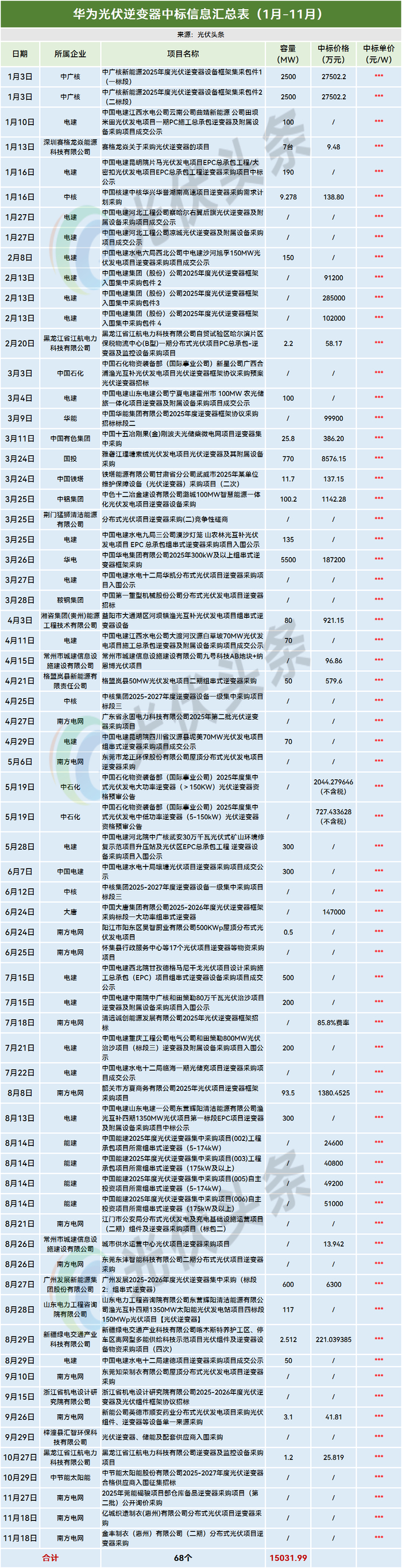 本统计周期,华为表现出色,位列中标榜第二名,中标中广核、电建、能建、中核、中国有色集团、中国石化、华能、国投、华电、中铝集团、鞍钢集团、南方电网、大唐、中节能等企业68个项目(标段),确定中标容量15.03GW。