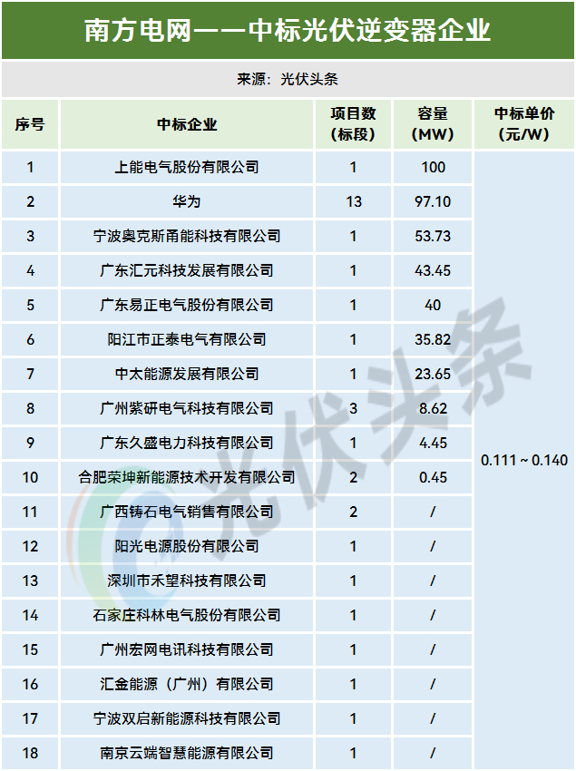 南方电网有34个项目定标,合计容量407.27MW。上能电气、华为、阳光电源、禾望电气、科林电气等18家逆变器企业中标。