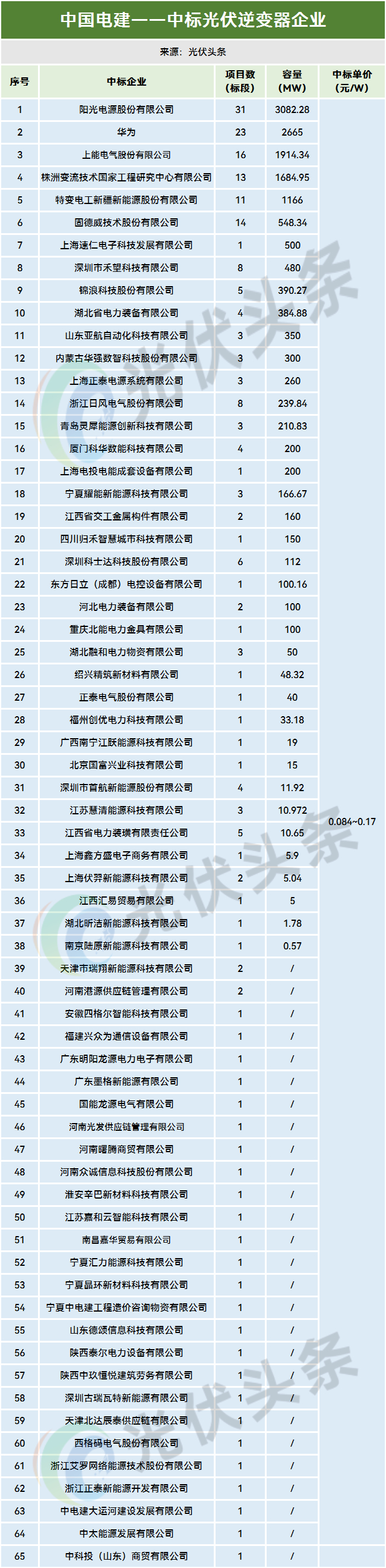 中国能建有16个项目定标,合计容量21.81GW。8月14日,中国能建20GW逆变器集采项目定标,阳光电源、特变电工、华为、固德威、上能电气、中车时代电气(株洲变流)、科华数能、科士达、首航新能、禾望电气等13家企业中选。